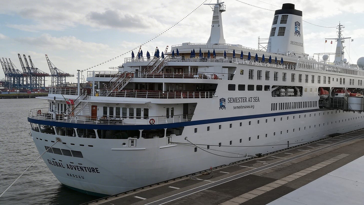 Basically it was a small cruise ship where 700+ students (mainly American) and teachers set off to circumvent the world by sea with something like 12 stops in various countries along the way (like Venezuela, South Africa, India, Hong Kong, etc.).