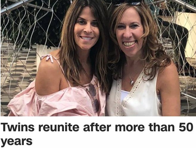 A news story comes on about two women who were identical twins that were separated soon after birth and then reunited after ~50 years.