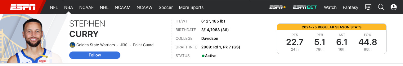 Most players will start to decline by their mid-30s, especially guards who rely on quickness and agility. Curry, however, continues to perform at an elite level after 16 seasons in the league.
