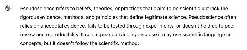 By definition, pseudoscience fails the test of reproducibility. As you see in the ChatGPT definition above.