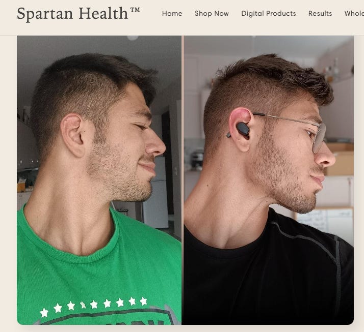 This is the before and after photo that the founder of this Spartan Health puts on the top of his homepage and the only difference between them is that he is sucking his tongue up to the roof of his mouth on the rightside one.