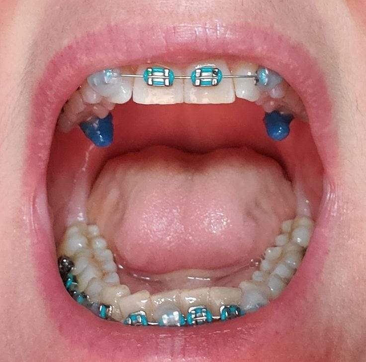 Some orthodontists use composite ‘turbos’ when applying braces. These are these blue things in the pic above.