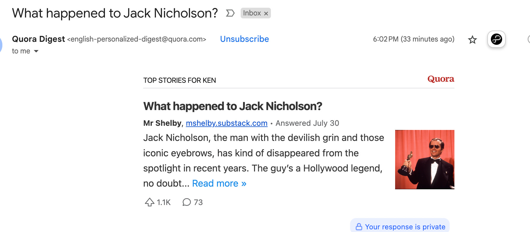 Today I got this email below from Quora with the question “What happened to Jack Nicholson?”